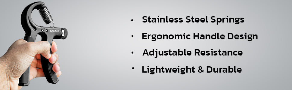 - DURABLE: Quality material used in boldfit handgrip exerciser e.g. spring made from high quality staleness steel, quality non- slip material used on handles. The grip strengthener, made of the latest upgraded material, has a longer handle than others, which is more convenient for you to hold; in addition, the handle material is strong and durable, which perfectly avoids the problem of the handle breaking during exercise! Overall its "made for bold" for last long.