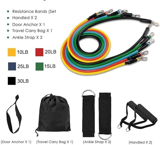 - ✅ CONTENTS: 1 x Yellow Tube (10 LB), 1 x Green Tube (15 LB), 1 x Red Tube (20 LB), 1 x Blue Tube (25 LB), 1 x Black Tube (30 LB), 2 x Ankle Straps, 1 x Door Anchor, 2 x Foam Handles, 1 x Workout Guide