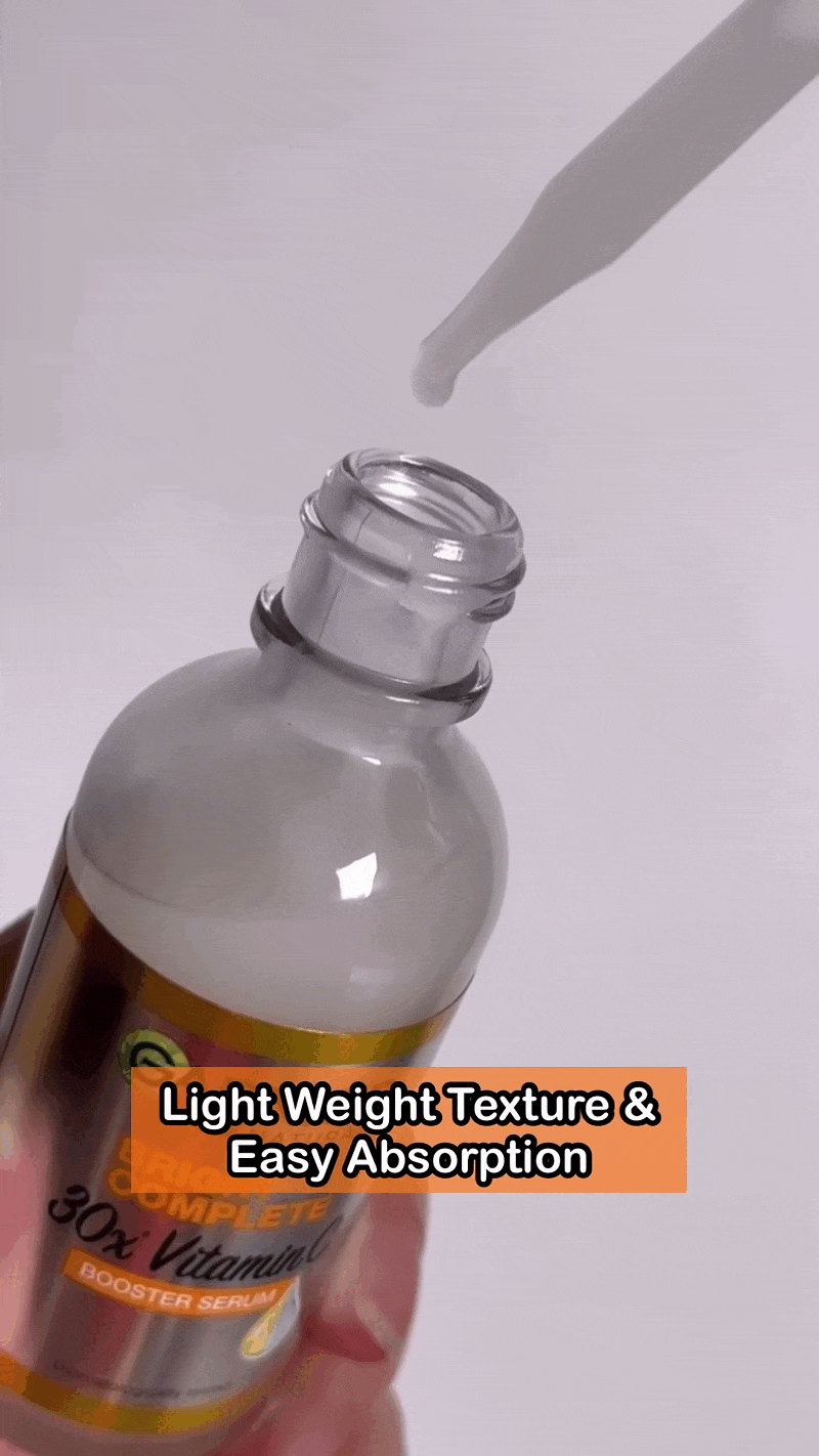 Looking to bounce back from dullness? All your skin needs is a fresh touch of Garnier’s Bright Complete 30X Vitamin C Booster Serum. Enriched with the goodness of antioxidants like Vitamin C, the Garnier serum replenishes your skin’s lost glow. Infused with Niacinamide and Salicylic Acid, the Garnier face serum leaves your skin feeling bright and refreshed. This vitamin C skincare treatment now comes in the form of Garnier’s most concentrated face serum. The face serum helps brighten your skin instantly and combating any acne marks, pigmentation, and dark spots. A promise of fresh and glowing skin, the Garnier Vitamin C serum works best because of its lightweight formula. The lightwear vitamin C serum penetrates the skin instantly without leaving it oily. The gentle, nourishing formula makes it suitable for all skin types - be it oily skin, dry skin, or even combination skin. Why wait? Show the door to a dull, lacklustre skin and trade it for brightened, spotless glow with Garnier Vitamin C serum. Bright Complete Vitamin C Booster Face Serum is Garnier's most concentrated brightening formula yet.