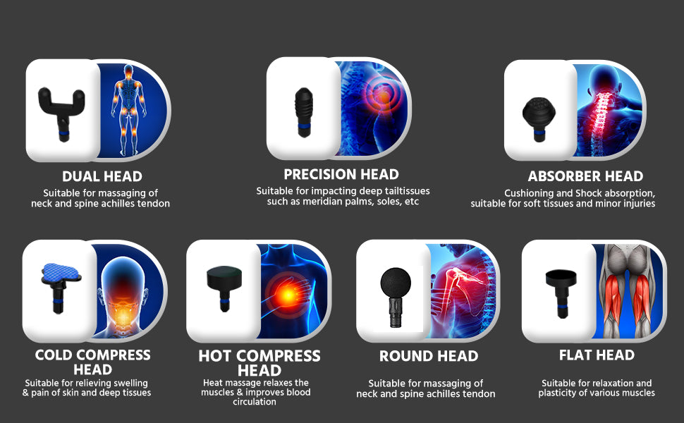 Comes with six ergonomically designed attachments for focused treatment on different muscle groups—neck, back, arms, legs, and joints,etc.