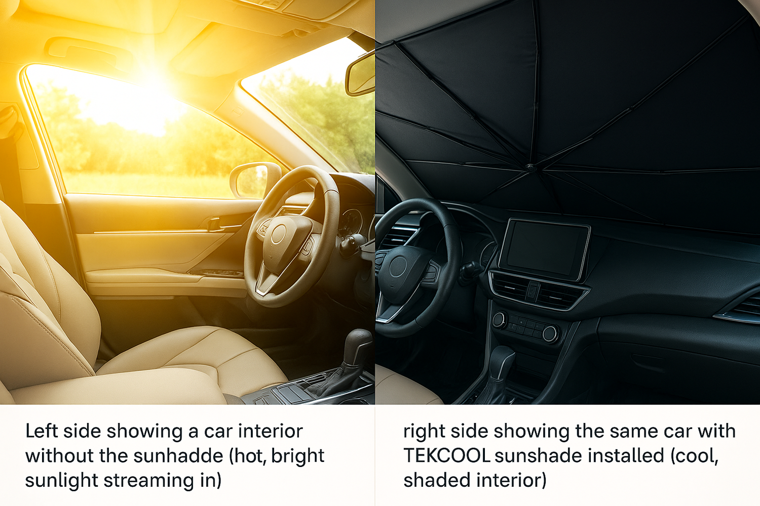 TEKCOOL sunshades can reduce interior temperatures by up to 40°F compared to unprotected vehicles. The advanced heat insulation technology keeps your steering wheel, seats, and dashboard significantly cooler.